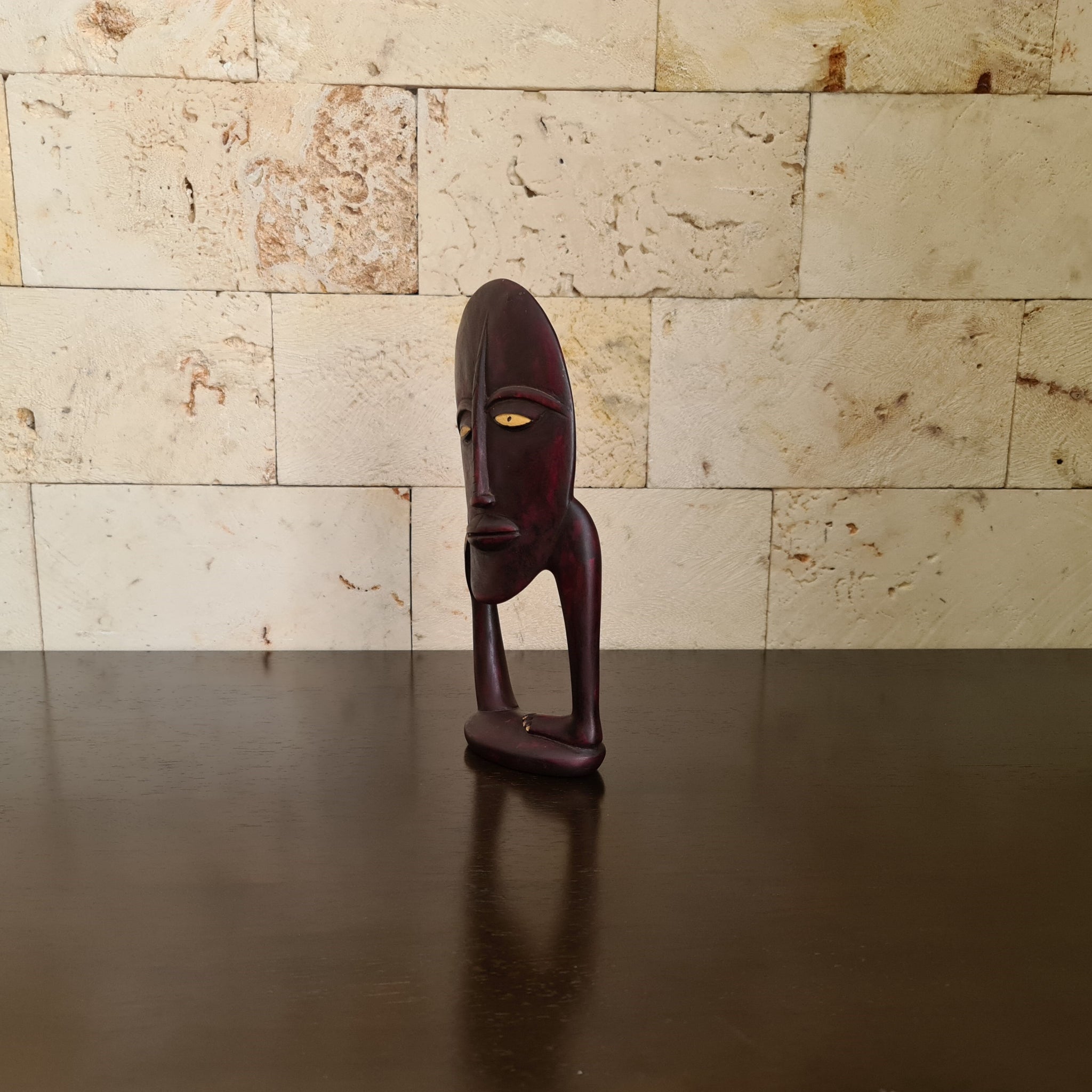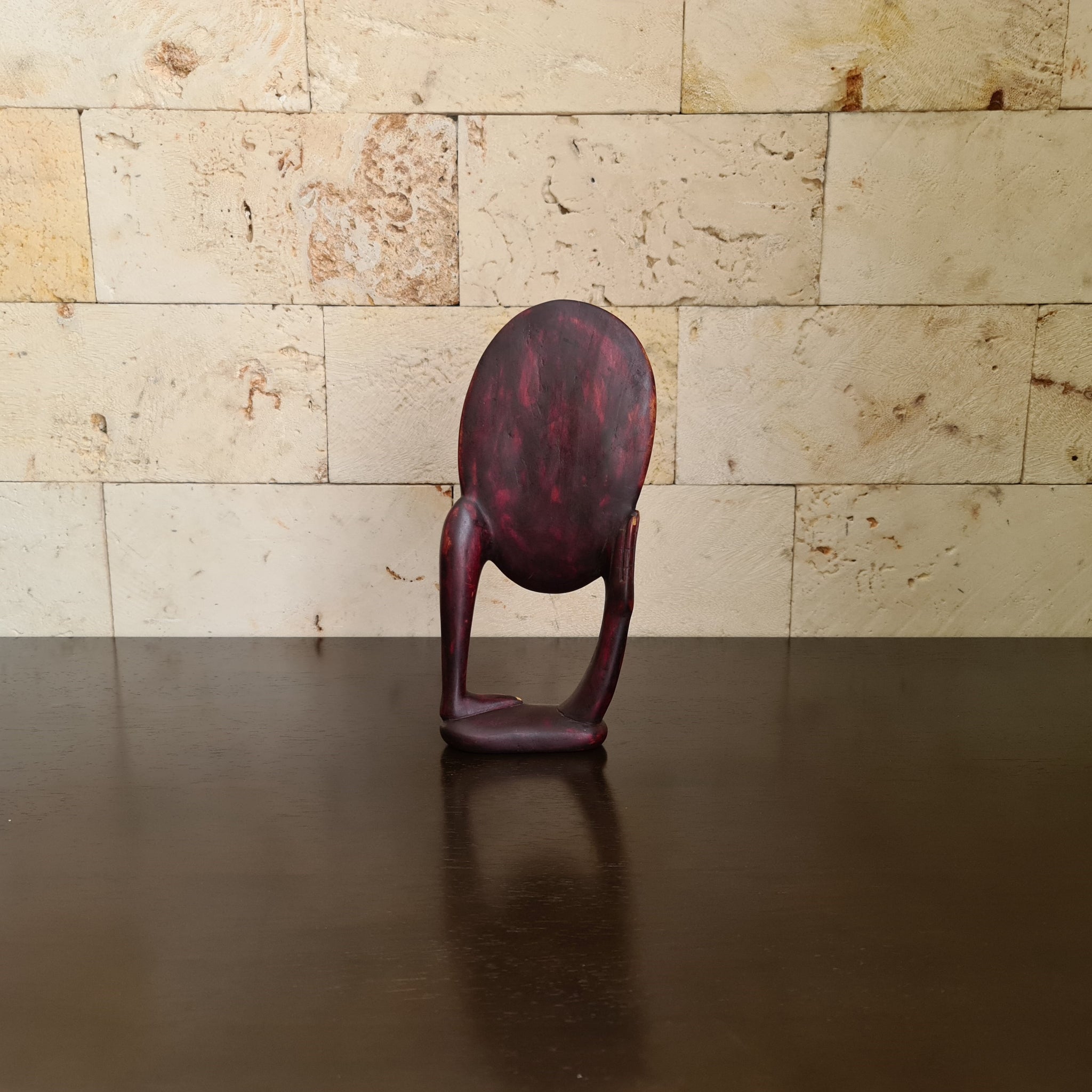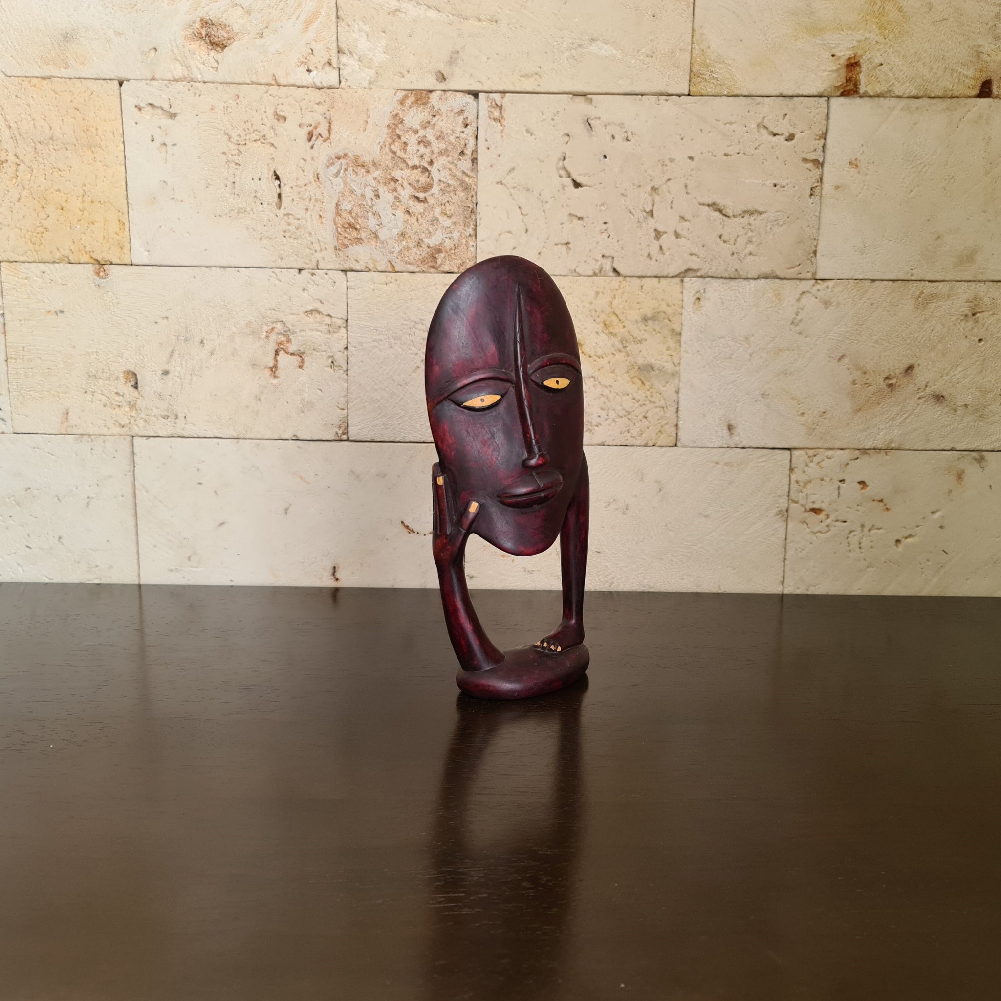 A wood carving depicting a Traditional African woman, hand/fingers on her cheek as if lost in thought...